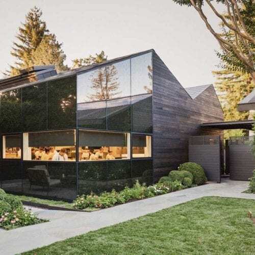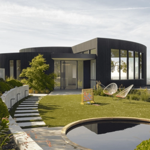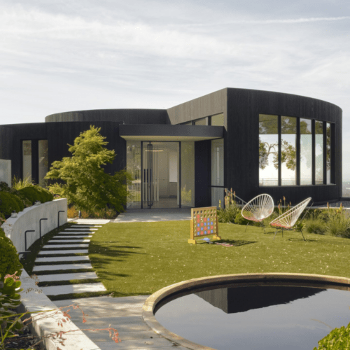 This uniquely shaped home in Los Altos Hills, California takes full advantage of its surroundings and adapts to challenging site conditions to create a singular residence.
