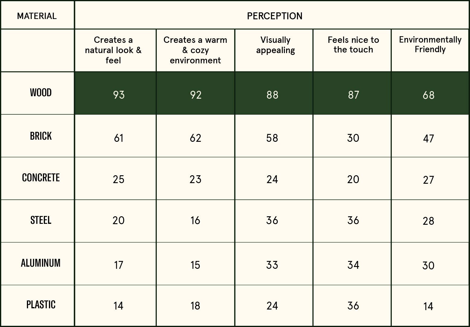 Aside from the researched benefits of mental, physical & social health, people have a positive perception towards wood in interiors.