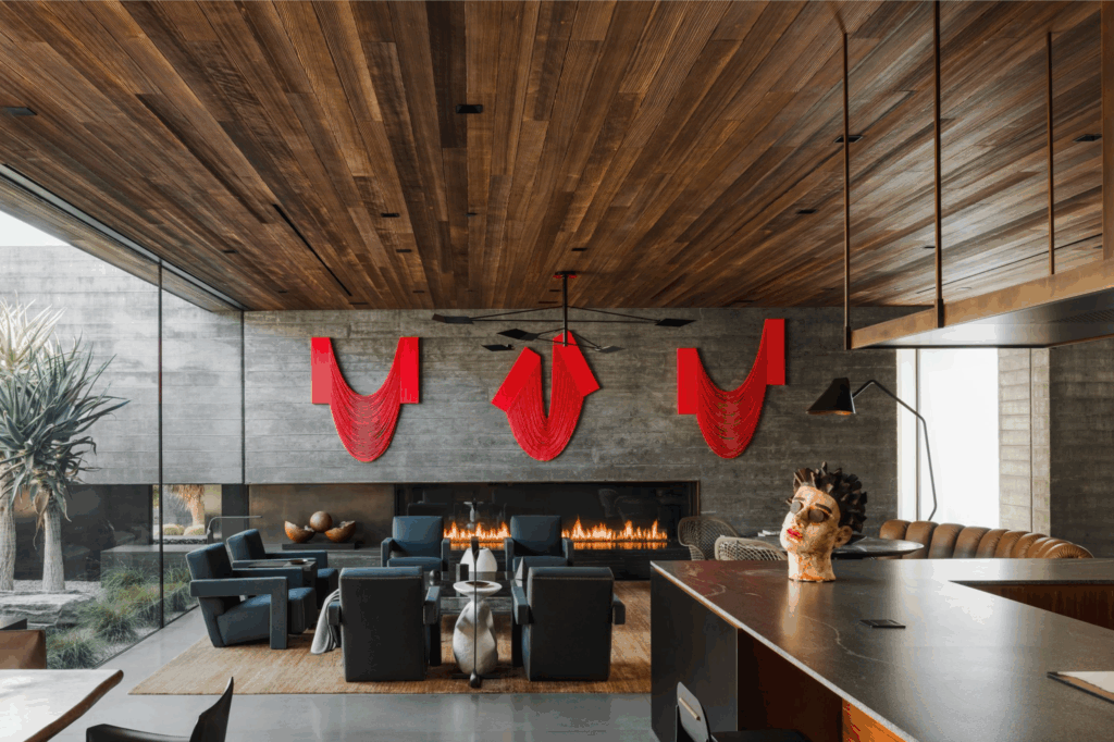 In this award-winning interior, a dark, custom-colored Redwood defines the space, cultivating a quiet, relaxed environment. The rich tones of the wood ground the mood, allowing the client’s vibrant artwork to take center stage.