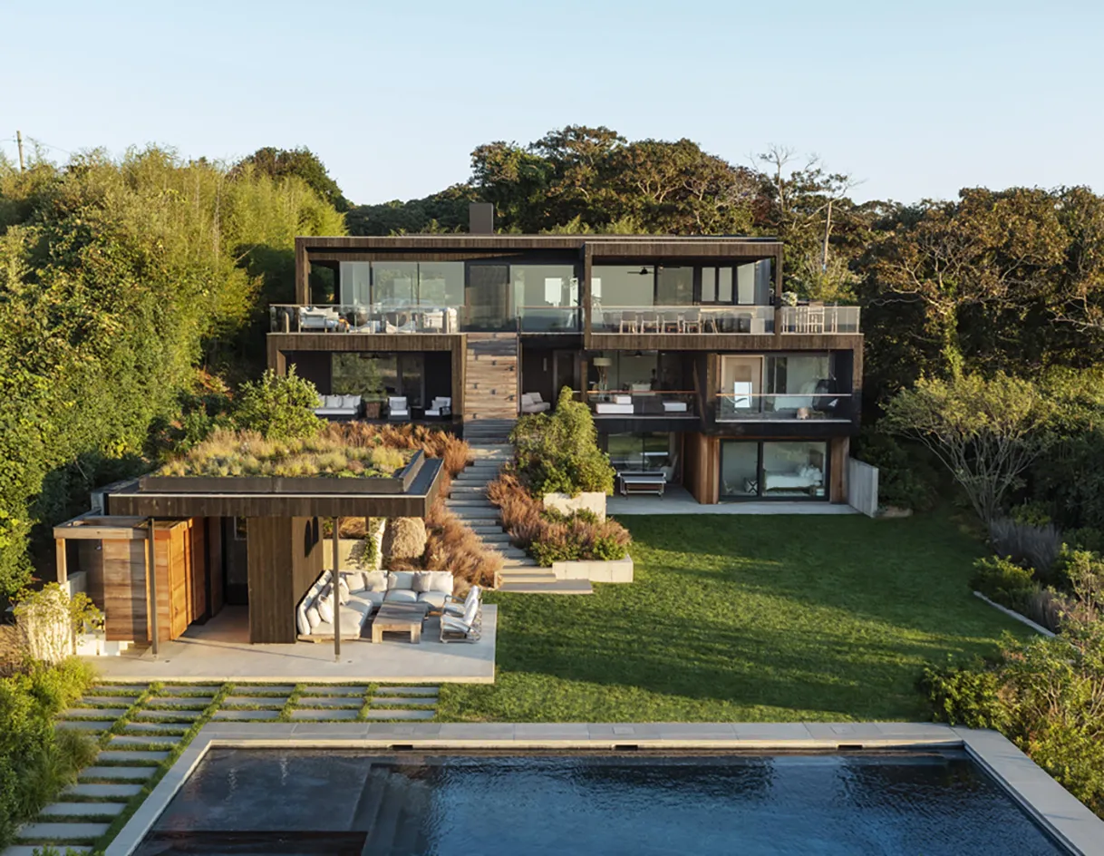 A Hither Hills villa designed by New York-based Robert Young Architects, peeks through lush foliage in its green Montauk locale.