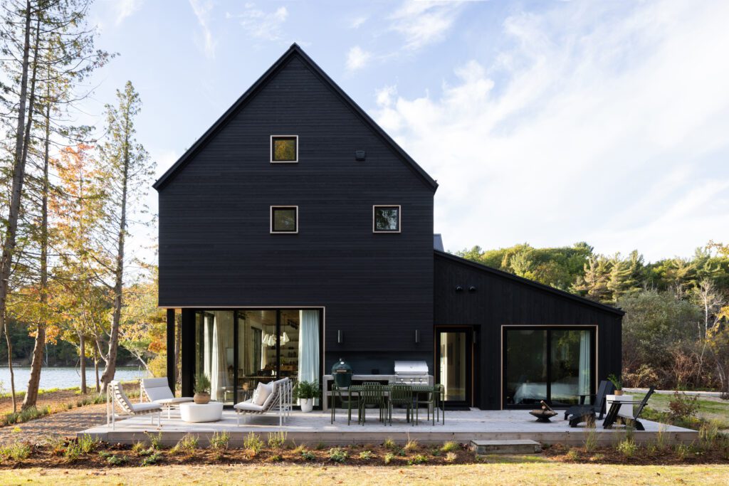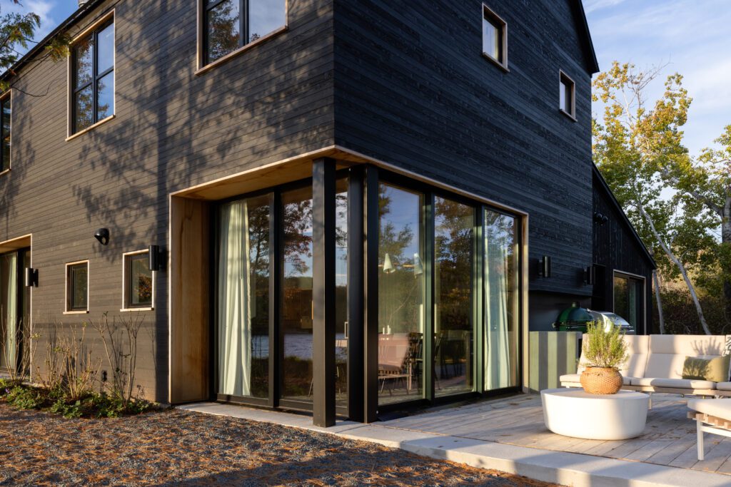 The lines of the house reference the lines of classic Michigan barns, and cladding it in shou sugi ban was the plan from the outset, Jocie says. “Especially considering the proximity to both the lake and the road, because of the super narrow site, the dark siding allows the home to nestle into its surroundings, almost like a camouflage.” The boards are 8-inch Western red cedar with a rough-sawn finish (on the garage and single-story section) and 4-inch Western red cedar horizontal boards with a smooth finish (on the main house), both in Delta Black, from Delta Millworks in Austin.