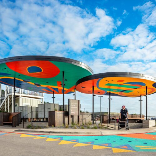 In partnership with architects The Beck Group and The Beck Foundation, Delta donated durable thermally modified wood material for this shade structure at Community First Village.