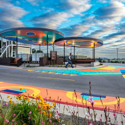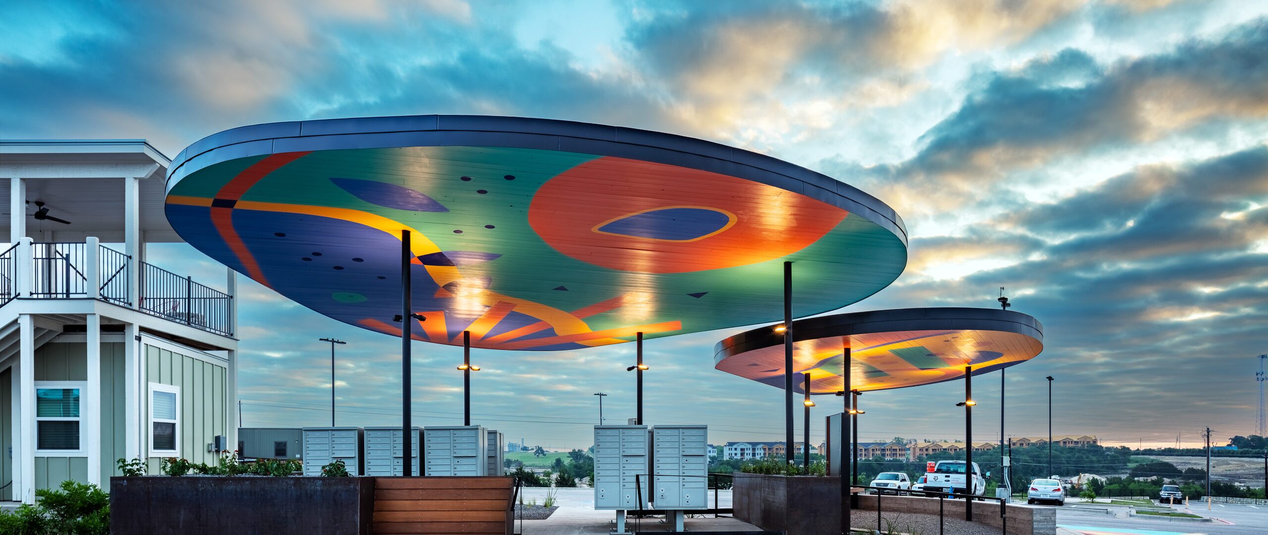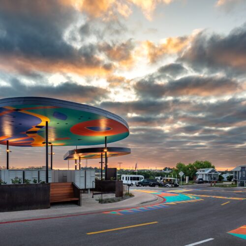 The mural is by local artist Emily Eisenhart, and adds a vibrant gathering place for residents and visitors. Community First Village provides permanent, affordable housing for residents coming out of chronic homelessness.