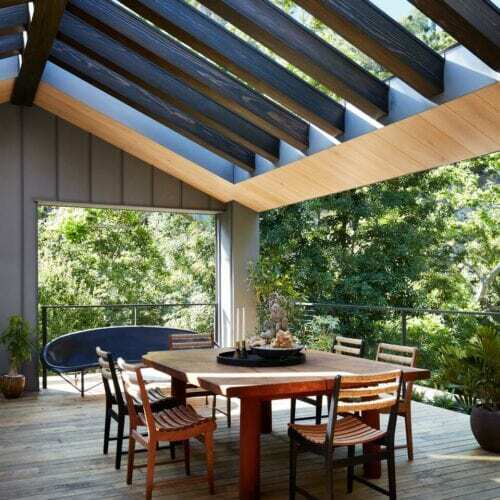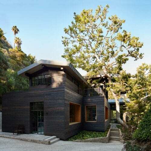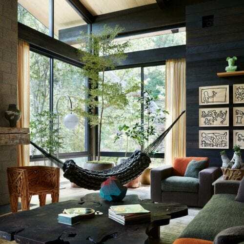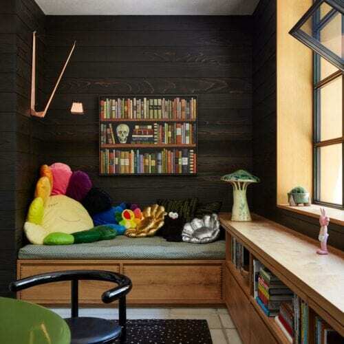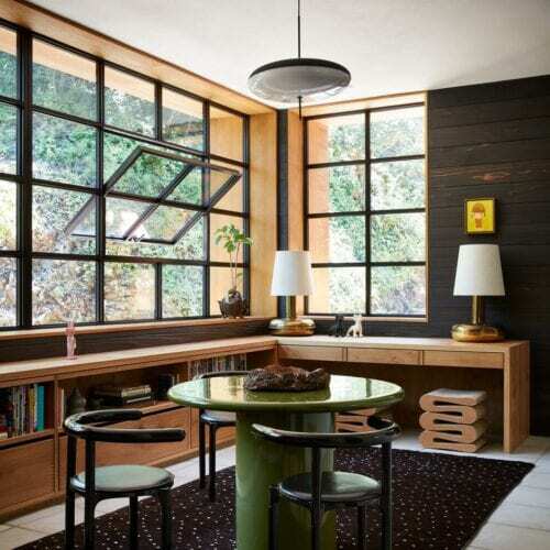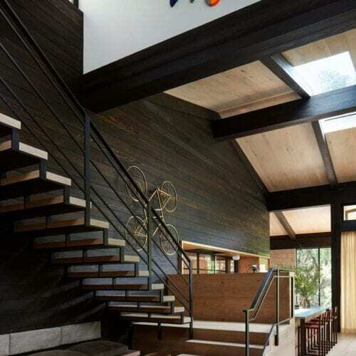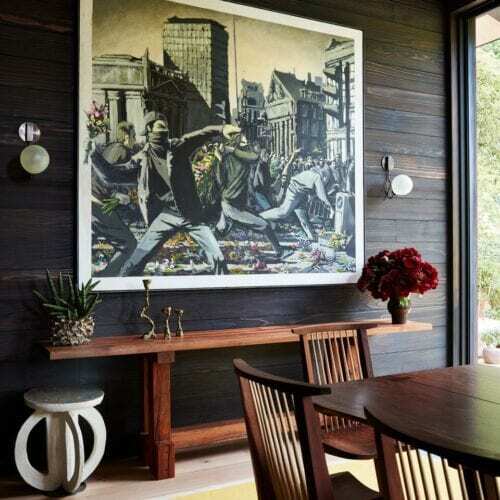 In a bit of architectural chiaroscuro, light-wood window frames on the exterior of the house hint at the materials composition of the interior, where the rugged, dark redwood is joined by ceilings and floors of more refined Dinesen oak. “We still wanted to bring the charred redwood inside because we thought the clients’ art collection, which is very active and full of vivid colors, would show best against a dark background. It’s much quieter than showing the art on typical white gallery walls. The blackened redwood really grounds it,” Shamshiri says.