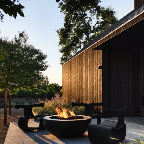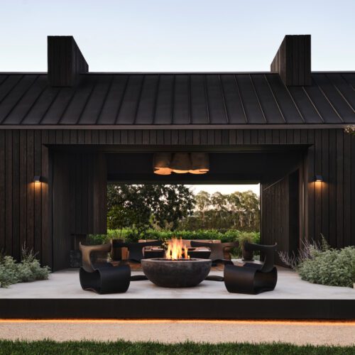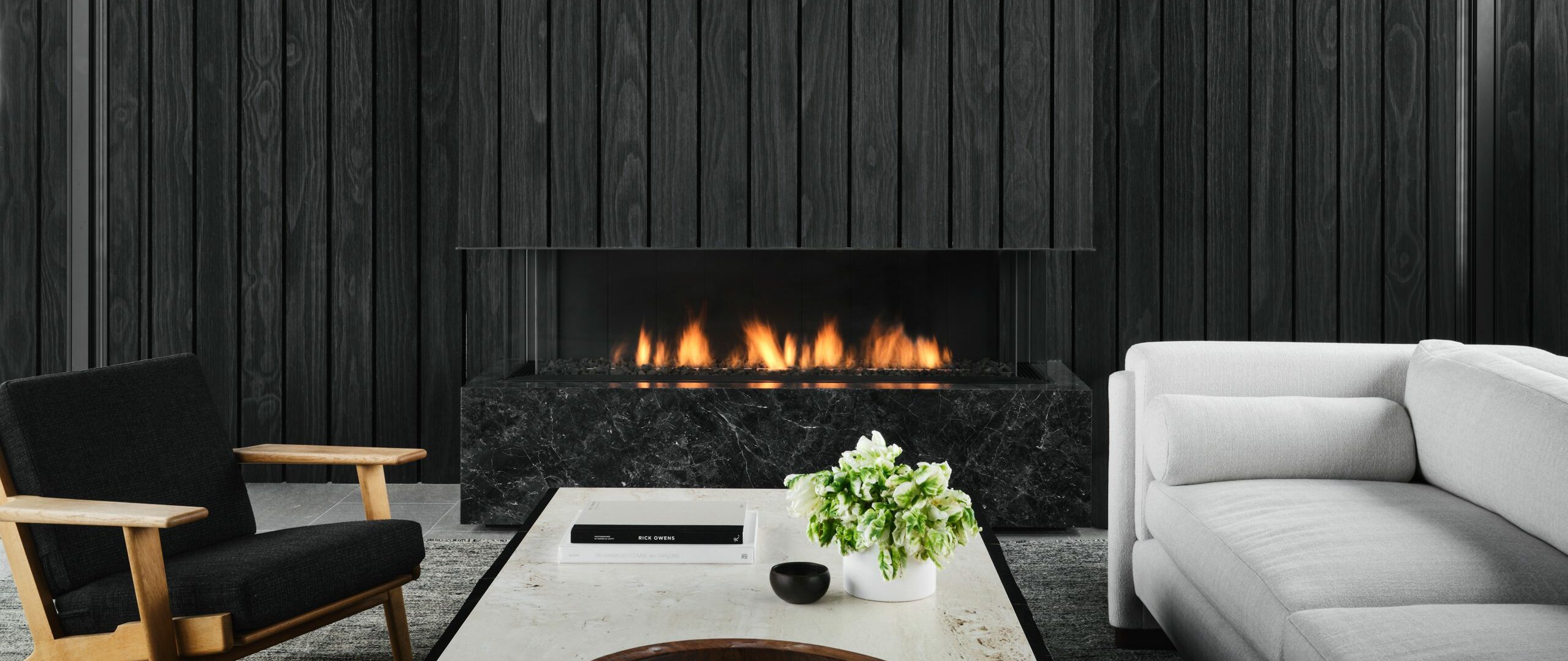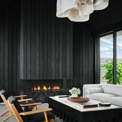 The deep, charred finish wraps around the structure, beautifully contrasting with luminous indoor furnishings and naturally bright spaces. This sleek, dark-toned aesthetic merges modern elegance with timeless warmth, crafting an inviting space that celebrates both texture and light.