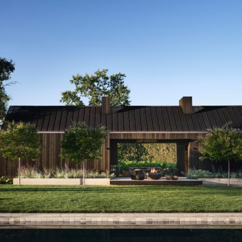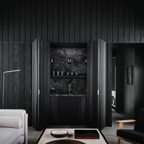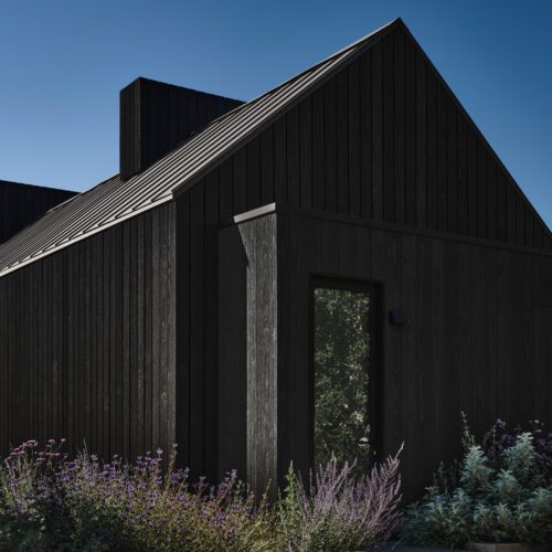 This striking guesthouse by Arcanum Architecture features both interior and exterior surfaces clad in Accoya Barnwood Delta Black, creating a bold, contemporary retreat.