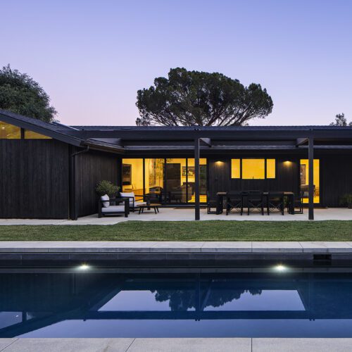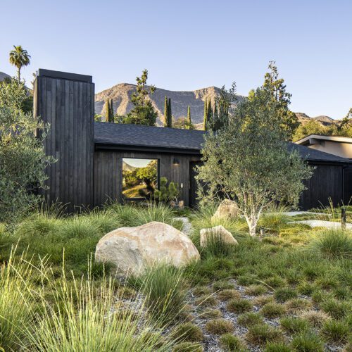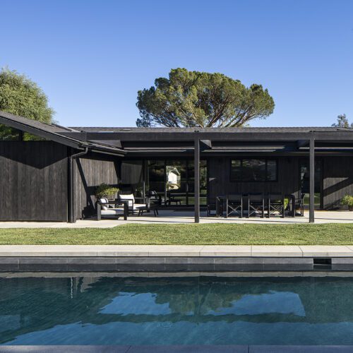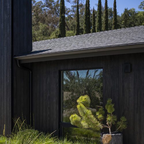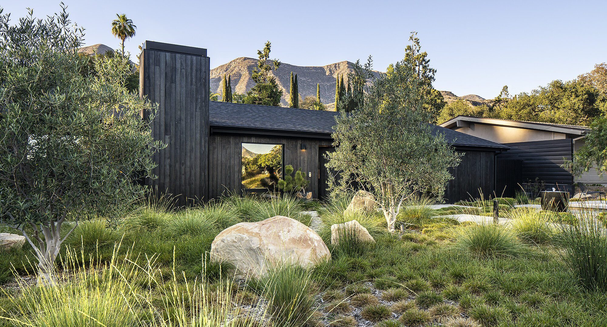 The charred, rich wood texture merges contemporary clarity with natural warmth, creating a cozy yet modern envelope that reflects its tranquil valley setting.