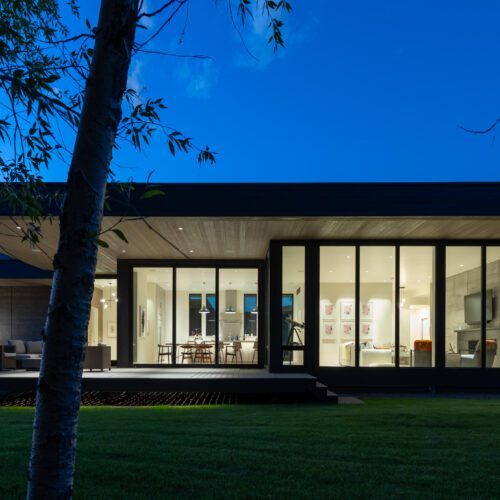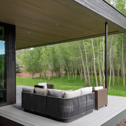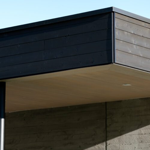 Hemlock Vertical Grain soffits in High West soften the outdoor patio spaces created by the shifting geometries of the home and its large, flat roof overhangs.
