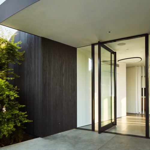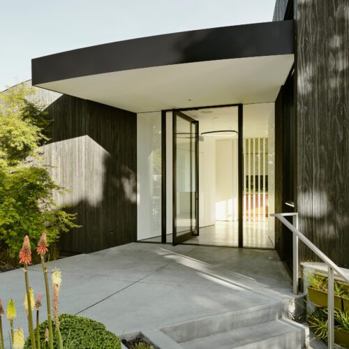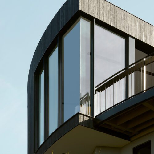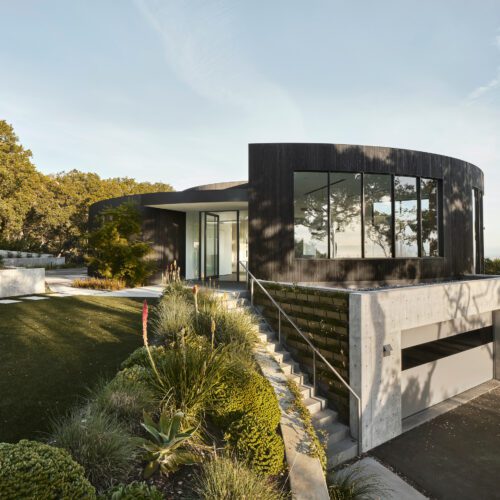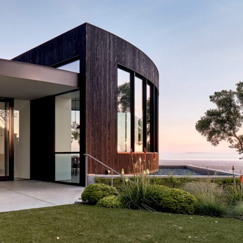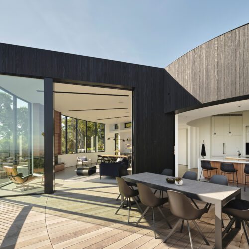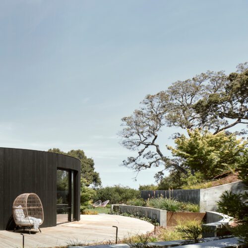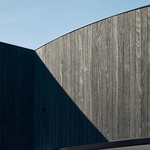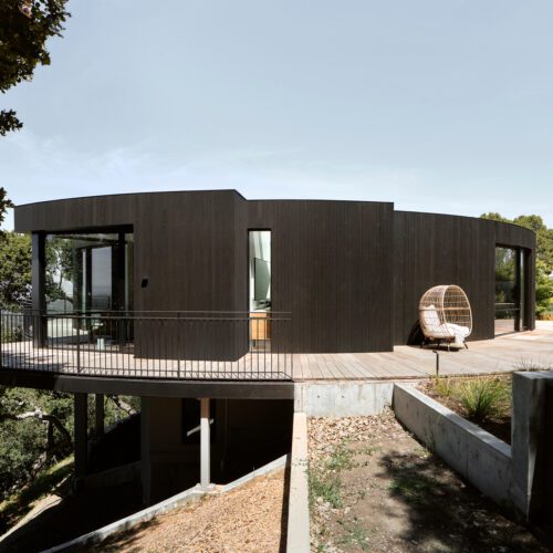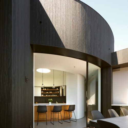 By incorporating sustainable materials, including the black Accoya from Delta that clads the rounded exterior, the house emphasizes connection to nature and health in its design.