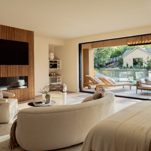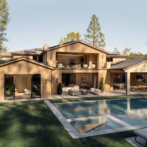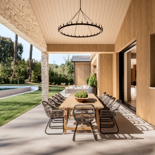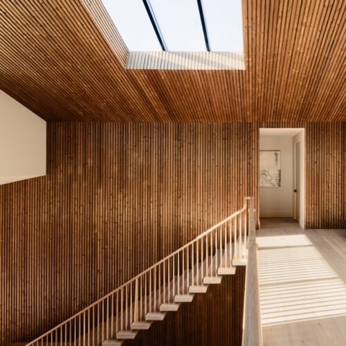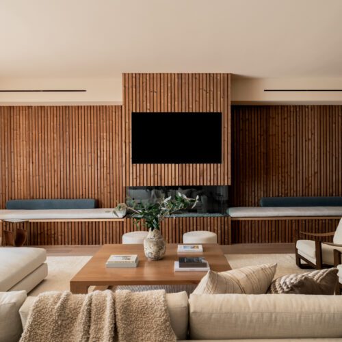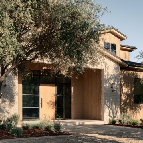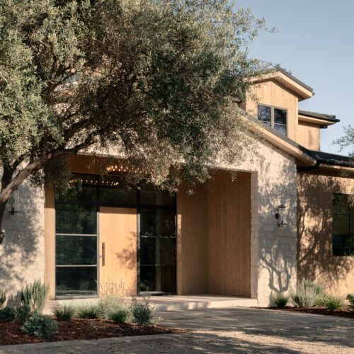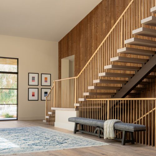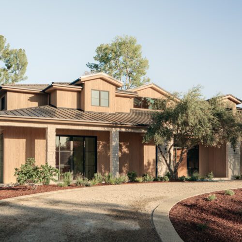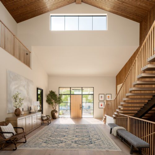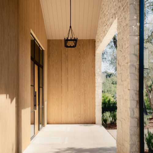 For this house in Hidden Hills, California, Steele Builders opted for a facade clad primarily in Accoya Barnwood 2.0 in Light Ivory. Inside, walls within the entry and living spaces feature slatted expanses of Lunawood Duo.