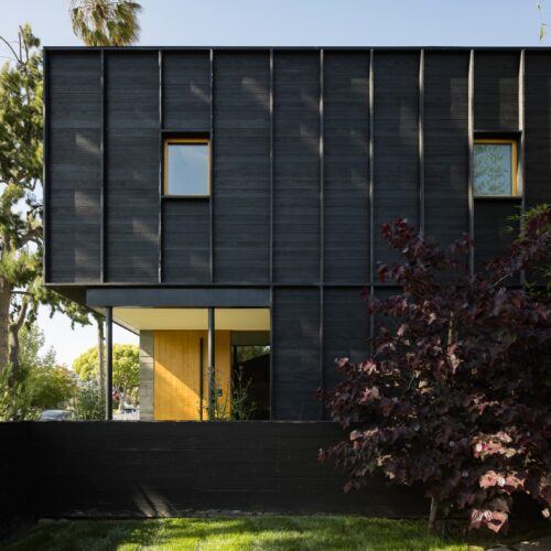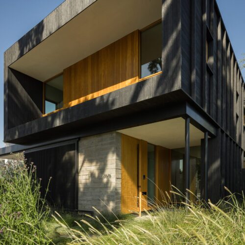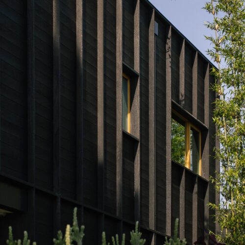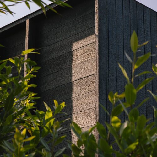 The exterior material of the house is a wood rainscreen with our Accoya | SSB | Gator. The charred surface provides protection from moisture and sun damage and inhibits insects.