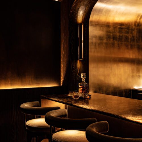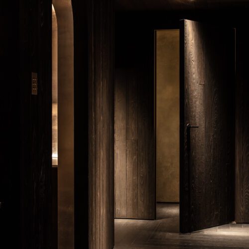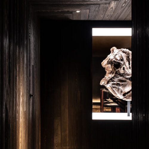 For the interiors of this residence in Brentwood, California, charred rough-sawn Cypress wood creates the atmosphere of a decadent, lush, and cozy area for lounging and relaxation.