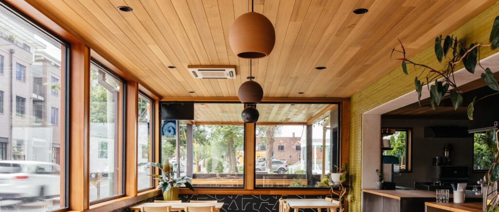 Vertical Grain cedar is sawn so that the growth rings run perpendicular to the face of the board. The uniform pattern gives a sleek and polished aesthetic, making it ideal for projects where a sophisticated and orderly wood texture is desired. Locust Restaurant in Nashville, Tennessee features vertical grain Western Red Cedar on ceilings, soffits, and the exterior.
